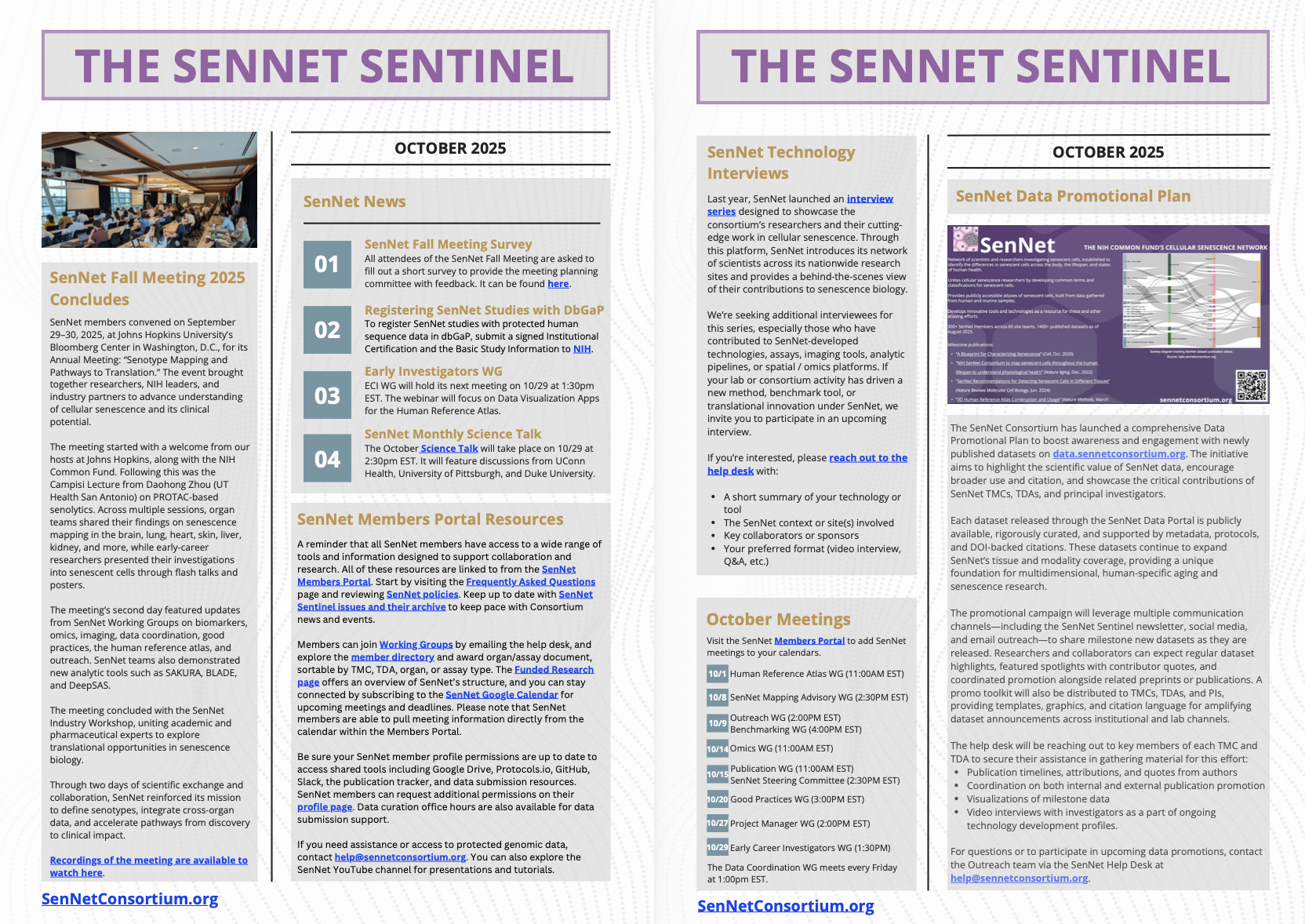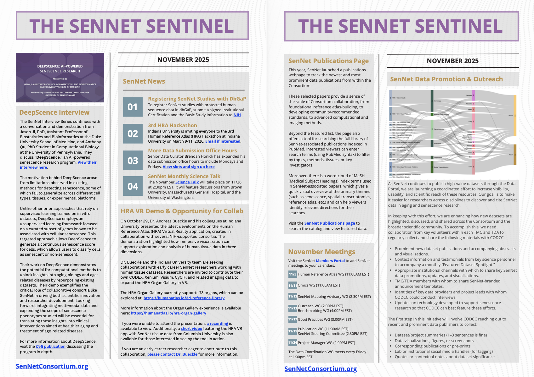 - The SenNet Interview Series continues with interviews with Laura Niedernhofer, Simon Melov, Patty Lee, and Hemali Phatnani. Email help@sennetconsortium.org if you’d like to be interviewed!