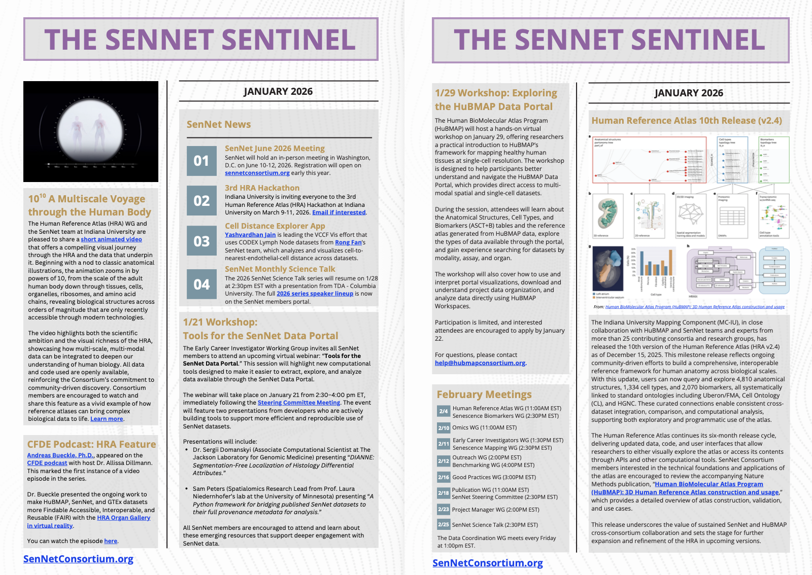 - “Human BioMolecular Atlus Program (HuBMAP): 3D Human Reference Atlas Construction and Usage” was published in Nature Methods on March 13, 2025, featuring the work of several SenNet authors. Read here. Additional supporting information can be found here. (March 2025).